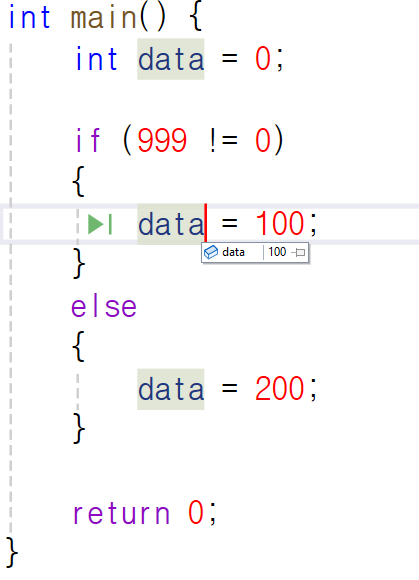 따라서 if 중괄호 안 구문을 실행합니다. 변수 data 안에 100을 대입하는 것이죠.