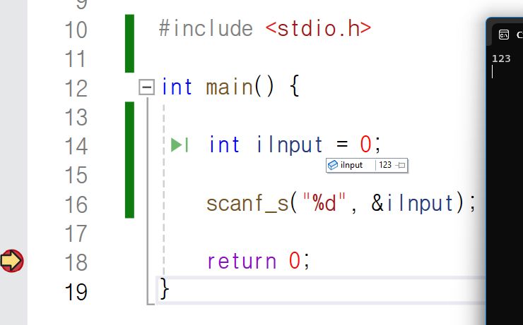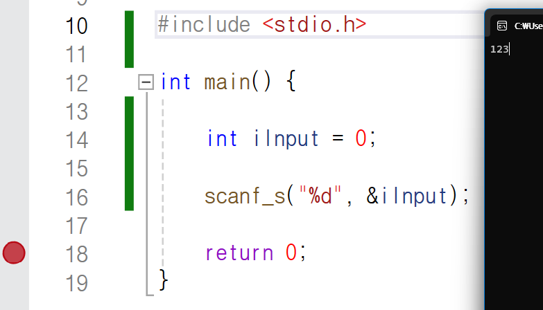 scanf_s 함수 안에는 값을 입력받을 때까지 종료하지 않고