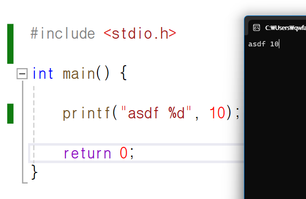 콤마 뒤에 입력한 실수 10.f가 %f 대신에 출력되는 모습입니다.