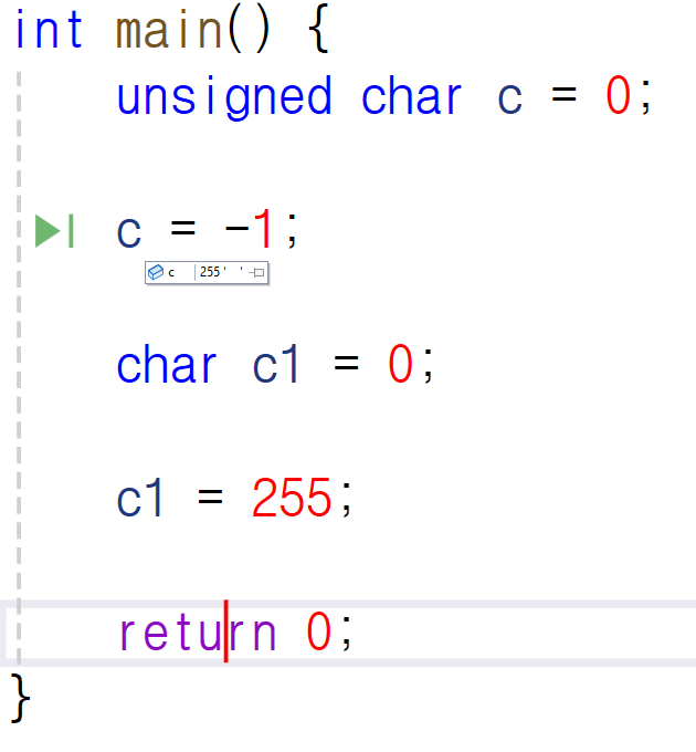 char형으로 선언한 변수 c1에 255를 대입하였을 때는 어떨까요?