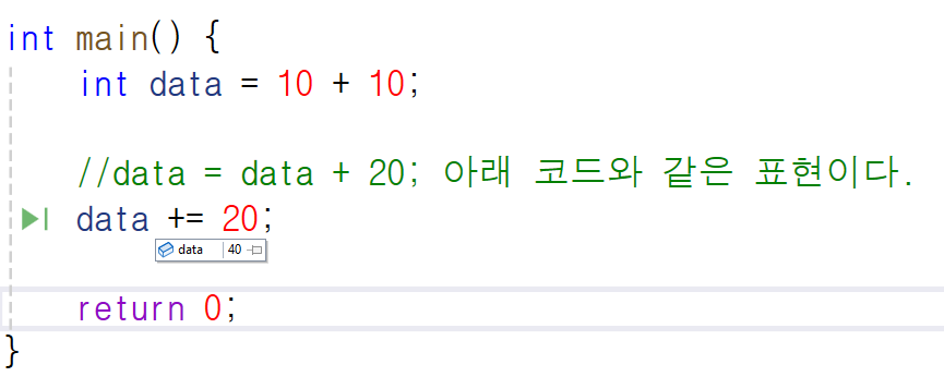 10과 10이 덧셈 연산되어 20이 변수 data에 대입됩니다.